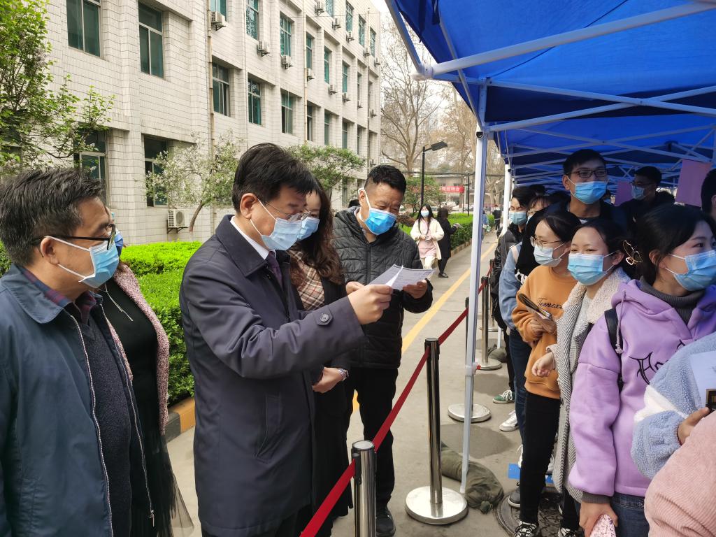 活动期间,姚文柱副校长深入现场考察、指导毕业生就业工作。他详细询问了招聘会组织情况及我校2021届毕业生就业进展,认真了解招聘会安全防疫情况。在学生排队处,他亲切询问学生就业情况,关心学生就业去向,指导学生简历内容。在展位场地内,他与各用人单位负责同志深入交流,了解用人单位人才需求,向用人单位对我校就业工作的支持表示了感谢。各学院党总支主要负责同志、各学院就业专干、毕业班辅导员也到场指导毕业生求职,向毕业生强调求职注意事项,了解毕业生求职愿望及用人单位需求情况。