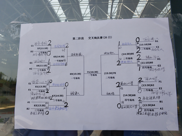 25日小组循环赛,我校代表队以小组第二,携手陕西师范大学进入第二轮单淘汰,对阵G组第一、东道主西安财经大学,我们显然处于不利位置;然第一局西安财经大学队在我校队强大的进攻下,失误频频,很快败下阵来;第二局开局阶段,我校队全力猛攻,财大叫了暂停,比赛进入胶着状态,比分交替领先,后半局我们失误增多,惜败一场;决胜局,我们注意保护,加强进攻,领先半节,交替后一次有争议的判罚,瞬间使我们处于不利境况,对手连连得分,在决胜局15分制的情况下,9:14落后,命悬一线,队长郑永才再次叫了暂停,这次暂停改变了比赛进程,大家过硬的心理素质充分表现出来,咬住对手,一分一分打,竟然,我们连得7分,以16:14拿下关键一局,闯进八强。