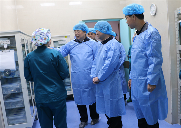 姚副秘书长首先来到急诊科,参观了急诊抢救设施、设备。随后姚副秘书长一行来到消毒供应室,认真听取了消毒供应室的精细化管理成果汇报,详细询问医疗耗材消毒、储存、分发到临床应用及物品回收的全过程。最后来到呼吸与危重症医学科,姚副秘书长关切询问了危重患者救治、康复情况,查看了ECMO设备及此项技术开展情况及成效,并询问了今年甲流疫情状况。