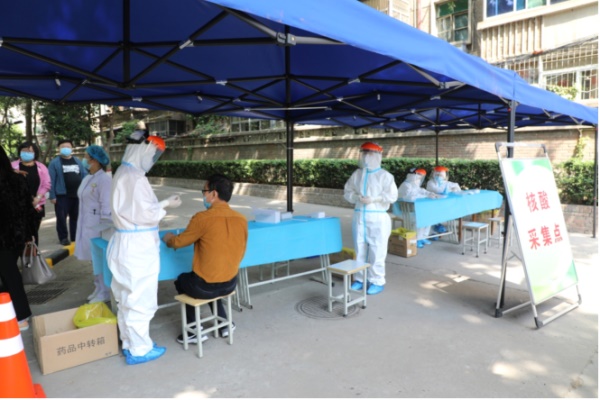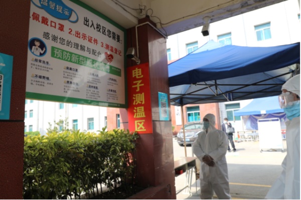为保证报到现场顺畅有序,我校含光校区设置了返校学生入校的固定通道。进校门时需查验“一码通”、核对身份、测量体温等,体温正常的同学进入校园后立即进行核酸检测,然后由学院辅导员在接待点为学生发放《学生返校复学疫情防控工作指南》、口罩及温度计等。学生填写错峰返校健康卡、签订承诺书后,由专人带领进入宿舍楼。在核酸检测结果未出来之前,学生不许出宿舍门,用餐通过扫码订餐,专人配送,确保返校过程形成严格的闭环。