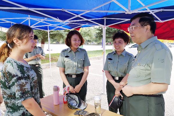 范兵书记向军训团参谋长详细了解了新生训练整体情况,对本次军训取得的初步成果表示肯定,对承训教官们的辛勤付出表示感谢,并向全体人员发表了热情洋溢的讲话。