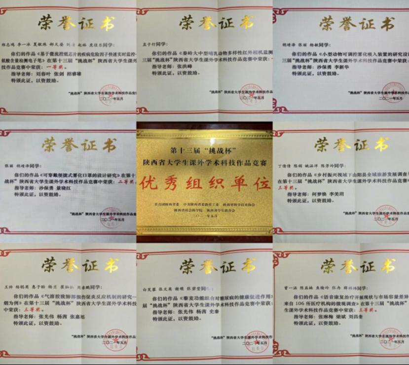 我校选送作品《基于微流控纸芯片的疾病危险因子快速实时监控--半胱氨酸含量检测电子笔》(指导老师:刘春叶、张剑、招睿雄)、《秦岭大中型哺乳动物多样性红外相机检测》(指导老师:张洪峰)荣获一等奖;《可穿戴便捷式雾化口罩的设计研究》(指导老师:沙保勇、景晓红)、《小型动物可调控雾化吸入装置的研究设计》(指导老师:沙保勇、李新华)荣获二等奖;《语言康复治疗开展现状与市场容量差异的研究--来自106所医疗机构的微观调查》(指导老师:张琳梅、梁斌、刘昌奎)、《乡村振兴视域下山阳县全域旅游发展调查与分析》(指导老师:何梦焕、李美玥)、《气溶胶致肺部损伤促炎因子反应机制的研究--以电子烟为例》(指导老师:张光伟、杨茜、张嘉旭)、《藜麦功能组合对糖尿病的健康促进作用》(指导老师:张光伟、杨茜、史秦)荣获三等奖。