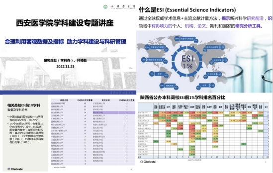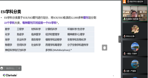讲座上,科睿唯安公司学术研究事业部业务总监杨志强,分别针对ESI相关概念及应用,我校ESI学科排名表现等内容进行了详细介绍与数据分析。我校目前进入ESI全球排名1%的学科分别是临床医学,药理学和毒理学两个学科,后续具有培养潜力的学科还有生物学和生物化学,神经系统科学与行为学,分子生物学与遗传学学科,同时化学,材料科学学科也具有潜在的发展优势。最后对我校ESI学科表现提升给出“摸清科研家底,精准凝练目标、紧盯前沿热点、细化任务措施”等建议。
