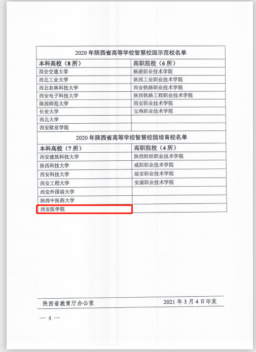 3月3日,陕西省教育厅发文公布了2020年度陕西省智慧教育示范县(区)、智慧校园示范校和培育校名单(陕教〔2021〕28号),我校入选陕西省高等学校智慧校园培育校。
