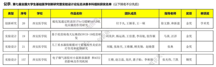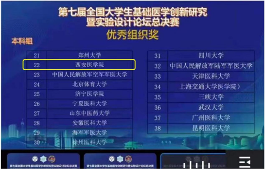 本次大赛从2020年10月开始启动动员、组织和选拔程序,有关校领导深入指导,基础医学部精心组织实施,督促指导教师跟踪指导项目。经过多轮汇报,并聘请校外专家评审,于今年6月份选拔出5个优秀项目,代表学校备战西部赛区分区赛。10月下旬,第七届全国大学生基础医学创新研究暨实验设计大赛本科院校赛道分区赛(西部赛区)在重庆举行。时逢西安新冠疫情扩散,全校学生封闭管理、学校封校、教师线上授课。面对突发情况和困难,在严格遵守疫情防控管控要求的前提下,校领导和基础医学部、学工部、校团委、教务处、信息技术处和保卫处等职能部门负责人敢于担当,出谋划策,为教师和学生进入校园线上参赛保驾护航。在分区赛中,学校5个参赛作品悉数获奖,取得了一等奖1项,二等奖3项,三等奖1项的好成绩;其中获得一、二等奖的项目被选拔进入全国总决赛。