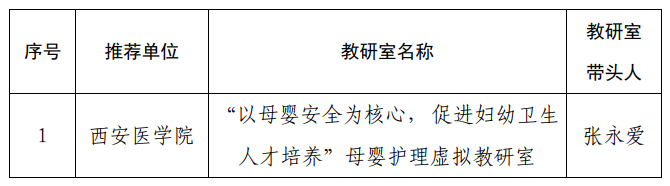 近日,省教育厅印发了《陕西省教育厅办公室关于公布陕西省虚拟教研室试点建设项目立项结果的通知》(陕教高办〔2021〕23号),我校母婴护理虚拟教研室获批省级虚拟教研室试点建设单位。