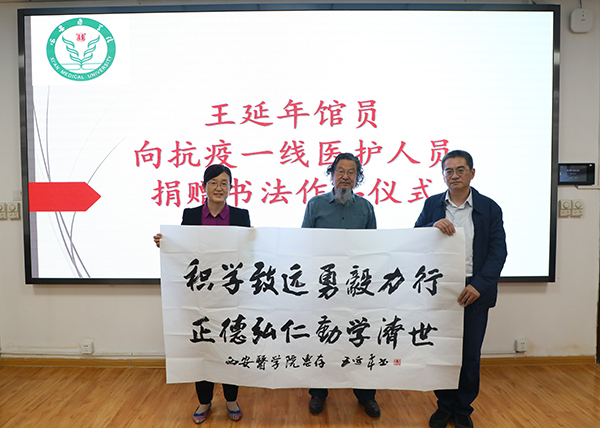 捐赠仪式上,熊冬梅高度评价此次疫情防护工作中各位医护人员所做出的舍小家为大家、逆行向前的无私奉献精神。对王延年馆员善思考、重学问、研书画,立万象于胸怀,不懈追求艺术的最高境界表示赞赏,并代表学校党委对此次捐赠表示衷心感谢。本次向抗疫一线医护人员捐赠书法作品活动中,共创作30余幅书法作品,捐给我校5所附属医院和26名援鄂英雄。