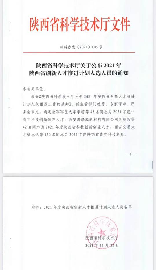 近日,陕西省科技厅印发了《关于公布2021年陕西省创新人才推进计划入选人员的通知》(陕科政发[2021]106号),我校基础与转化医学研究所余琦教授入选获得“陕西省中青年领军人才”称号。