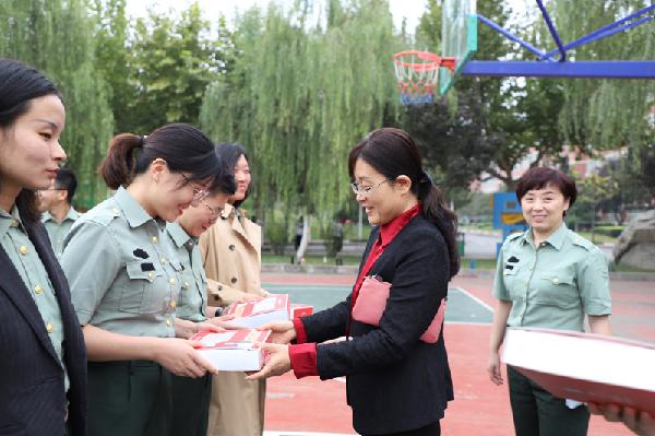 9月25日上午,党委副书记熊冬梅率工会干部一行前往学校操场,为奋战在军训一线的辅导员们送上慰问品,也带去了校党委、校工会对同志们的亲切关怀和问候。