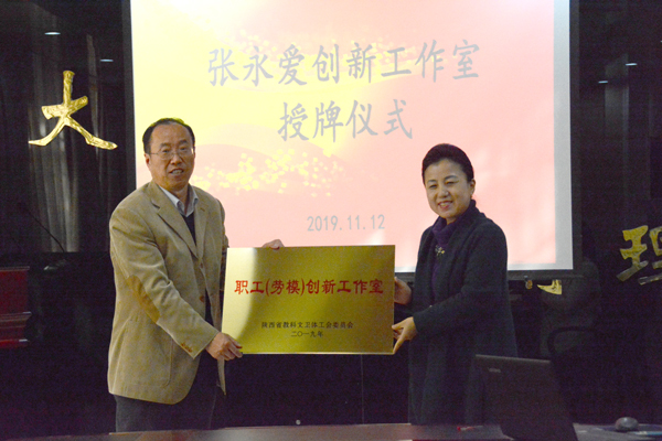 根据《陕西省教科文卫体工会关于在全系统继续开展职工(劳模)创新工作室创建活动的通知》(陕教科文卫体工发〔2018〕1号)和《关于印发< 陕西省总工会关于进一步深化劳模和工匠人才创新工作室创建工作的指导意见>的通知》(陕工发〔2018〕26号)文件精神,按照《陕西省职工(劳模)创新工作室管理办法》的相关要求,我校申报的“张永爱创新工作室”获批。11月12日上午,陕西省教科文卫体工会主席陈建树一行专程来到我校,为我校张永爱“职工(劳模)创新工作室”授牌。校党委副书记、工会主席熊冬梅,副主席白万晓,团队成员参加仪式。