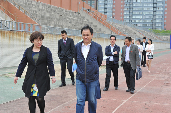 专家组考察学校的体育场馆和设施器材
