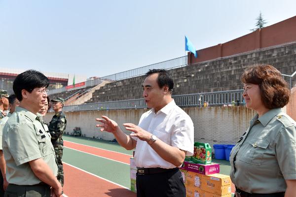 杨帆院长分别向军训团参谋长、武装部负责人详细询问了新生训练的整体情况,并现场发表热情洋溢的讲话:“2019年军训工作已经进行一半时间,自工作开展以来,西安武警支队全体教官以高度负责的精神、认真严谨的态度、扎实过硬的作风,较好的开展和推进各项训练任务,我首先代表学校对承训部队全体教官的辛勤付出表示衷心的感谢和诚挚的问候。军训是大学生活的第一课,通过军训不仅仅能锻炼学生的体质,同时也能够有效提高学生的国防意识、政治觉悟、爱国热情,对同学们今后学习生活中养成良好的品质都有着重要的意义。希望全体教官能够继续保持良好的精神面貌,发挥人民军队的优良作风,进一步严格要求、严格训练、严肃纪律,教育引导广大学生传承军人优良作风,锤炼吃苦耐劳、克服困难、团结协作、互助友爱的优秀品质,培养团结拼搏、永不言败的奋斗精神,形成自立自强、奋发有为的意志品格,为今后的学习生活打下坚实的基础”。最后,杨帆院长代表校党政向各位教官送上清凉饮品,亲切与各学院负责人、跟训辅导员进行交谈,询问存在的困难和问题,对大家表示真挚的慰问。