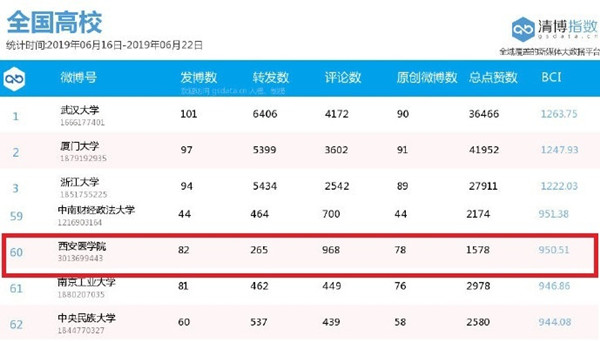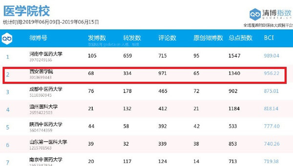 近日,根据最新公布的《陕西高校官方微信公众号周数据排行榜》《全国医学院校微博指数排行榜》《全国高校微博传播指数排行榜》数据显示,我校官方微信在陕西省高校中排名第3,官方微博在在全国高校中排名第60,全国医学院校中排名第2,我校官方微信和官方微博影响力再度提升。