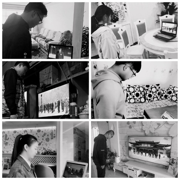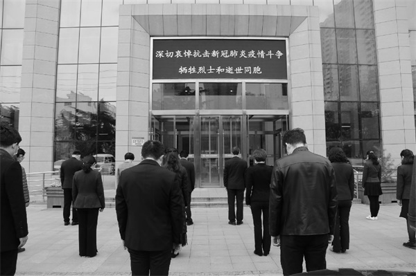 在未央校区致远广场,竖立黑底白字横幅“沉痛哀悼新冠肺炎疫情牺牲烈士和逝世同胞”。党委书记范兵,党委副书记、院长杨帆以及在校在岗的部分教职员工自发来到这里,深情凝重面向国旗肃立。10时整,防控警报鸣响,集体默哀三分钟,向抗击新冠肺炎疫情牺牲烈士和逝世同胞默哀。