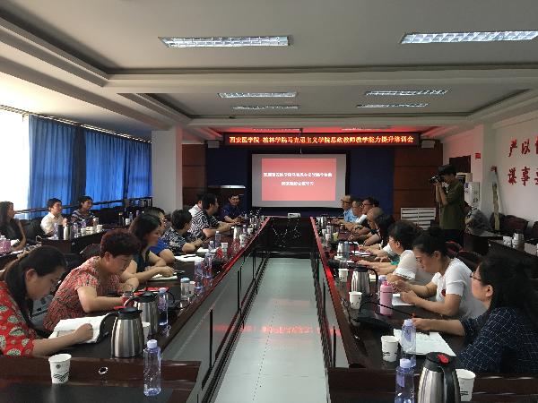8月29日上午,培训会开班仪式在榆林学院会议室举行,马克思主义学院院长桑利娥主持。会上榆林学院党委副书记尚爱军代表榆林学院致辞并简要介绍了榆林学院的基本情况和办学方针。我校党委副书记熊冬梅代表学校对榆林学院的支持表示真挚的感谢,她强调此次培训会的目的是为了提升思政课的质量与水平,并对参会的教师提出四点要求:一是有政治担当,坚持教书育人,带着使命学习;二是通过交流,借鉴好经验、好方法,带着虚心学习;三是勤思多想,不断钻研,带着问题学习;四是有目标、有计划、有方法,带着任务学习。之后,西安电子科技大学马克思主义学院党委书记夏永林教授,作题为《全面准确地理解、宣传习近平新时代中国特色社会主义思想》的报告,他分别从对当前高校新思想“三进”工作认识、全面把握新思想形成的背景和内在逻辑、全面准确把握新思想的内涵及理论品格、学习理解新思想需要有正确的方法指导等四个方面进行讲授,着重强调要用新思想武装青年学生,实现新思想“进教材、进课堂、进头脑”的“三进”工作,这是高校“培养什么样的人、怎样培养人、为谁培养人”的根本政治任务。下午,两校思政课教师在榆林学院行政楼会议室就思政课教学方法与经验进行深入的学习交流。座谈会上,榆林学院马举魁教授就《党中央转战陕北红色文化资源与高校思政课建设》进行生动详实地讲解,同时两校教师分享了各自在思政课教学方面的成功经验和举措。