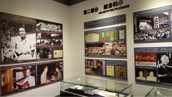 进入展厅“中国的骄傲”五个大字首先映入眼帘,右边是一块带有先生头像的展板,赫然写着“把一切献给祖国教育科学事业的时代先锋”。整个展厅以“不懈求索”“献身科学”“教书育人”“赤子情怀”“风范永存”五个部分集中展示了侯伯宇先生的光荣事迹及坎坷光辉的一生。