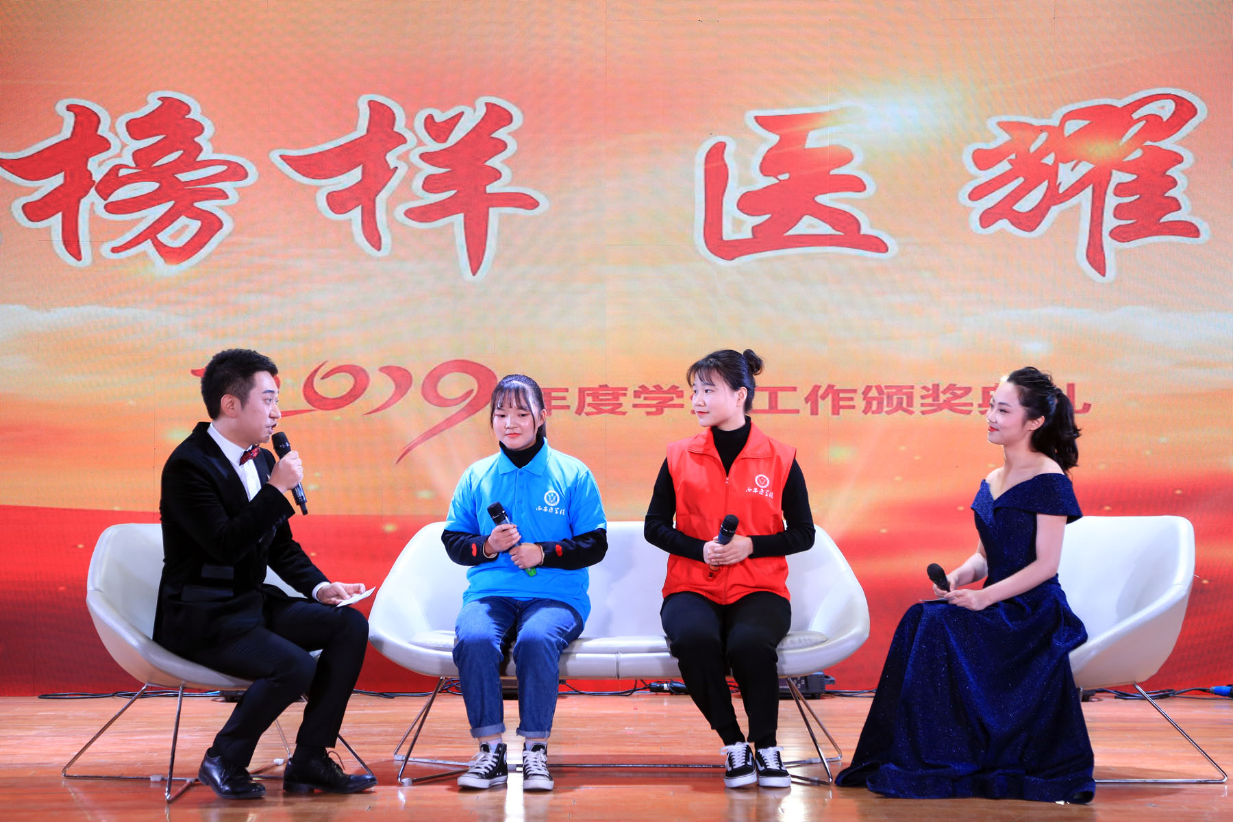 颁奖典礼通过走红毯、“2019年学生工作回顾”“学霸天团”“服务的红纽带”“西医FAMILY”以及“假如我是你,我想对你说”专项育人工作展示等9个环节将榜样教育与激励教育紧密结合,每个环节用精彩的视频展示了我校人才培养工作取得的累累硕果,与会领导嘉宾为获奖的集体和个人颁发了荣誉证书与奖牌。典礼中间穿插了师生采访、辅导员工作谈心谈话及歌舞表演等内容,采访的话题直击学生心灵深处的堵点与困点,谈心谈话聚焦学生工作的难点与热点,引发全场师生思考与共鸣,歌舞表演特别融入心理健康手语操表演,青春靓丽,点燃了全场师生的热情,烘托出了热烈的气氛,将颁奖典礼推向了高潮。