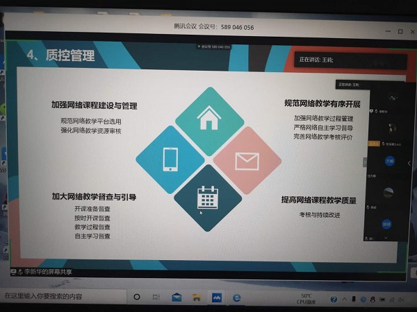 首先,苏兴利处长传达了全省高校在线教学质量提升暨2020年高校教育教学及科技工作视频会议讲话精神。会议提出三个要求:要求高校积极应对疫情,持续抓好在线教学质量的提升;挖掘教育教学资源,保证在线教学质量;做好开学后线上线下教学工作衔接。希望各高校将特殊时期展现出的民族精神事件转化为思政教学资源。会议部署了2020年全省高校教育教学工作要点:一是紧抓立德树人根本任务;二是着力深化“四个一流”建设和创新创业教育改革两大核心战略;三是谋求课堂革命、卓越拔尖人才培养、质量文化建设三大突破;四是继续抓好专业建设、“双高计划”、产教融合、继续教育四项具体工作。