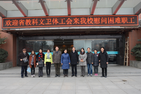 2019年1月18日上午,陕西省教科文卫体工会主席陈建树、副主席陈鹏等一行3人来到我校,开展送温暖,慰问困难教职工活动,党委副书记、工会主席熊冬梅参加活动,几位领导亲手把慰问金交到困难教职工手中。