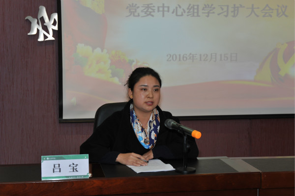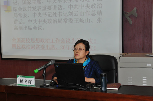 党委副书记熊冬梅作专题学习辅导。她首先介绍了全国高校思想政治工作会议召开的概况及背景,系统梳理了最近几年中央召开的有关会议及相继出台的加强高校思想政治教育的有关文件,指出此次会议规格高、精神新,充分体现了以习近平同志为核心的党中央对高校思想政治工作的高度重视,是党中央对高校党建工作在继承基础上创出的新高度。接着她从为何要重视高校思想政治工作、高校为谁培养人、如何培养人、如何做好思想政治工作、高校党委如何做、高校党的基层组织如何做、高校教师如何做七个方面解读了习近平总书记的重要讲话精神,突出强调习近平总书记讲话是指导做好新形势下高校思想政治工作的纲领性文献,对于加强党对高校的领导、办好中国特色社会主义大学和世界一流大学,加强党的建设和意识形态工作、推动党和国家事业发展,都具有重大而深远的意义。最后她就如何学习贯彻此次会议精神提出三点意见:一是深入学习领会,重在提高思想认识,推动学校党建和思想政治工作强起来;二是准确把握学习贯彻落实的六个重点;三是强化问题导向,发扬改革创新精神,在解决学校党建和思想政治工作突出问题上取得实质性进展。