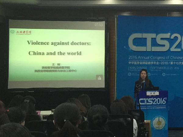我校内科学教研室青年教师王轲在分会场作了《Violence against doctors: China and the world》的交流发言。她先梳理了《中国医师执业状况白皮书》《新英格兰医学杂志》《柳叶刀》关于中外暴力伤医等相关问题的权威调研,然后分析了国内外医患关系紧张的根源和医患矛盾频发的深层次原因,大胆设想和积极探索了缓解医患关系的对策和方法。王轲的交流发言,数据详实,论证严密,观点新颖,激起与会同行的共鸣,引发大家的热烈讨论。