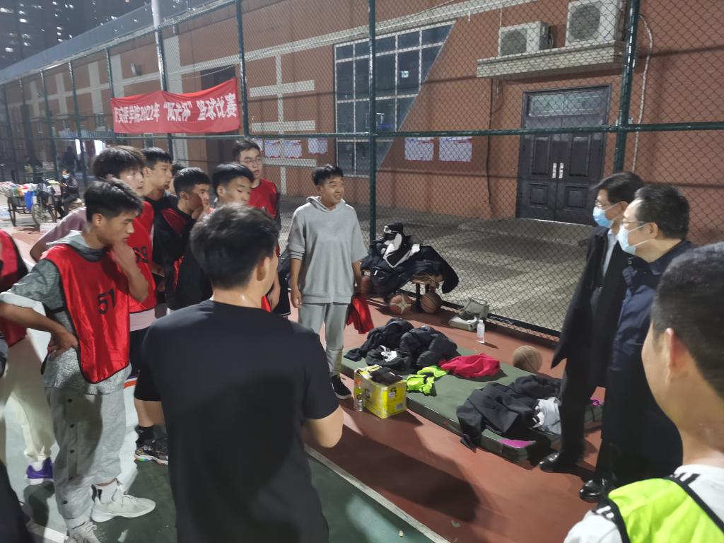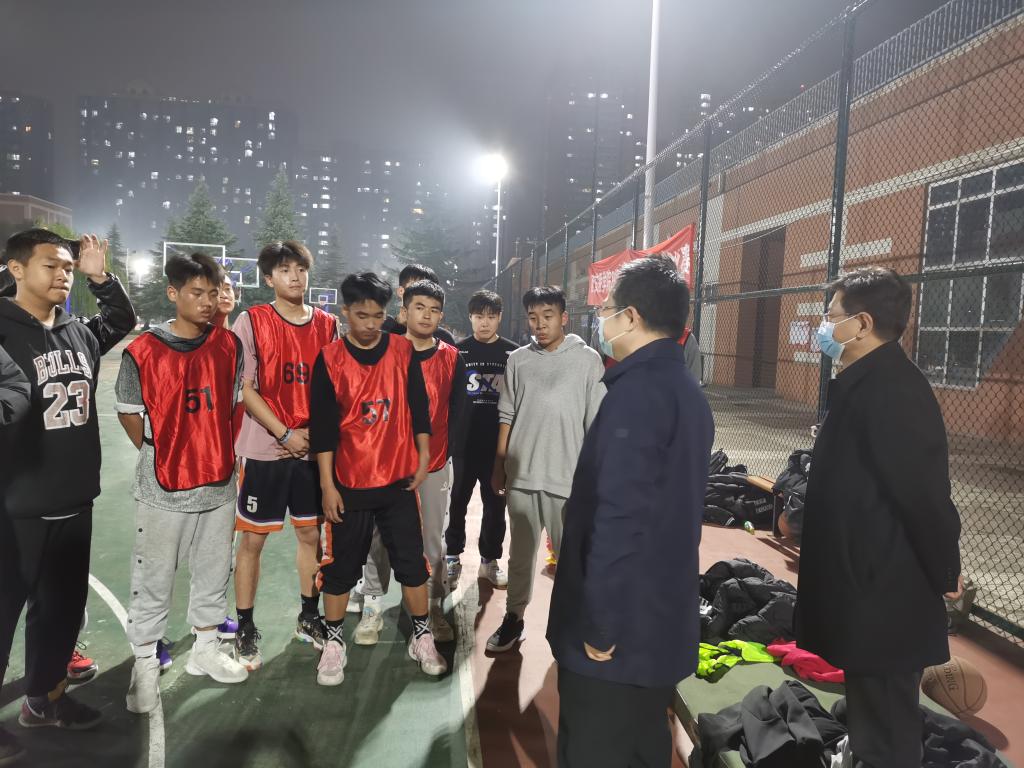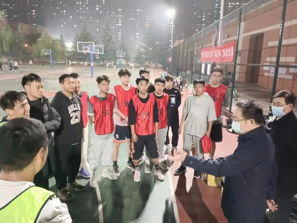 (党宣快讯)20日傍晚6:30,基础体育党总支教职工和校男篮在未央校区体育场进行友谊赛。党委书记刘岭、副书记姚文柱到场观看比赛并讲话。半场休息期间,校领导了解了我校男篮训练情况,对疫情封闭管理期间能够坚守教学阵地的体育部和基础医学部教师表示慰问。指出要多组织此类师生联动的文体活动,以多种形式发展阳光体育活动,丰富广大师生的校园生活。