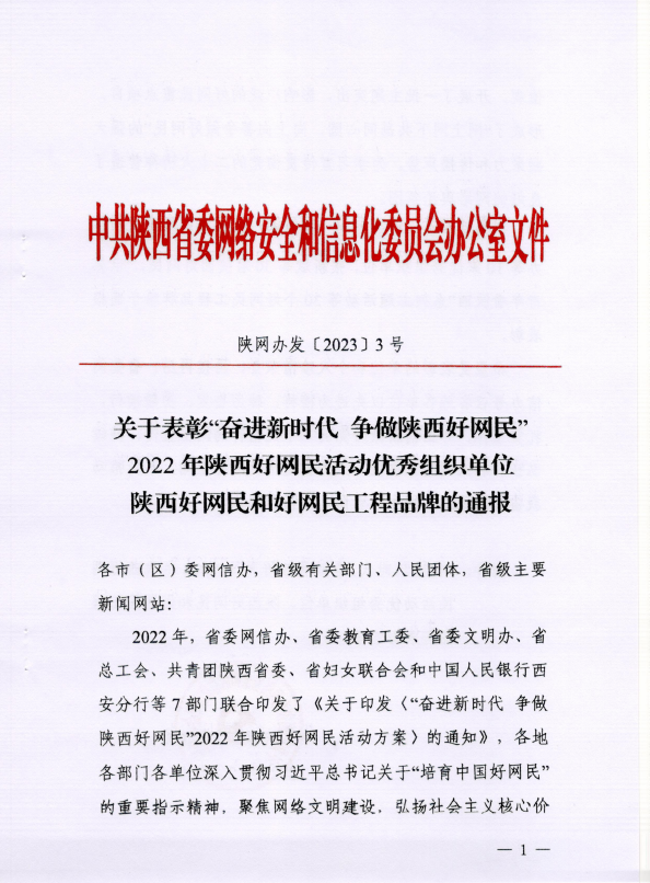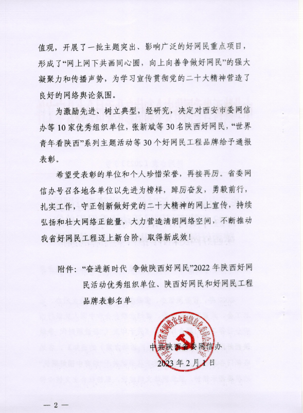 经推选、初审、复审环节,2022年陕西好网民活动评选出好网民30名、好网民工程品牌30个、优秀组织单位10家。我校“小红砖青年说”荣获陕西好网民工程品牌表彰。