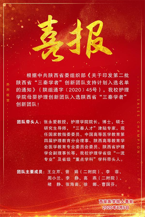 近日,中共陕西省委组织部印发《第二批陕西省“三秦学者”创新团队支持计划入选名单的通知》,以我校护理学院院长张永爱教授为带头人申报的“leyu·乐鱼(中国)体育官方网站母婴护理创新团队”入选陕西省“三秦学者”创新团队支持计划——“创全省一流团队项目”名单,支持经费100万元。