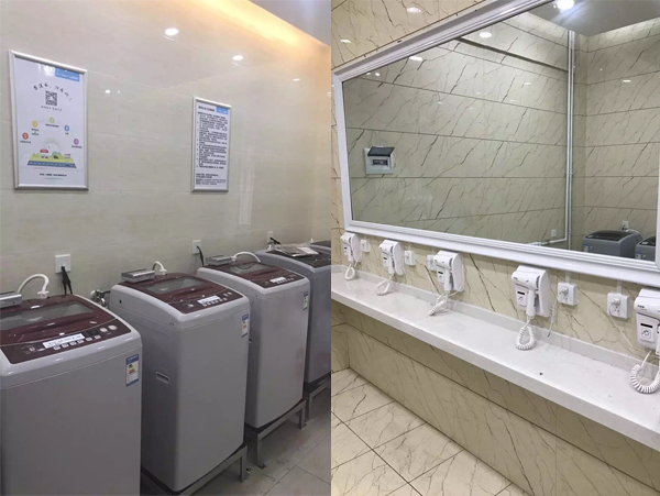 公寓内设计了单独的洗衣房,同学们可以通过刷卡或扫码支付,洗衣房配备了吹风机,既方便了学生使用,又避免了宿舍内使用大功率电器。值班室配备了微波炉、针线包、工具箱等,更贴近学生生活。