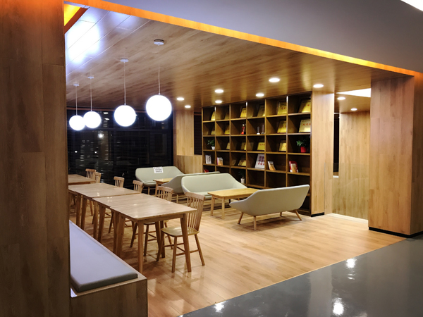 二楼为休息阅读空间和党团活动室。同学们可以在这里阅读报纸、杂志,开展读书沙龙活动,是一个可供交流和放松的休闲场所。党团活动室作为第二课堂,同学们可以进行精品课程的学习,开展“三会一课”等党团活动。