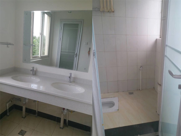 公寓走道重新安装了照明灯、制作了豆沙绿墙裙,整体更加明亮舒适。宿舍内安装了防盗门,墙面进行了整体粉刷,更换了洗漱池和卫生间内设施。对宿舍内的电路进行了改造,每个床位均布置了插座,方便安全了学生用电。