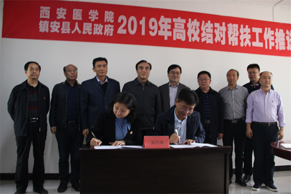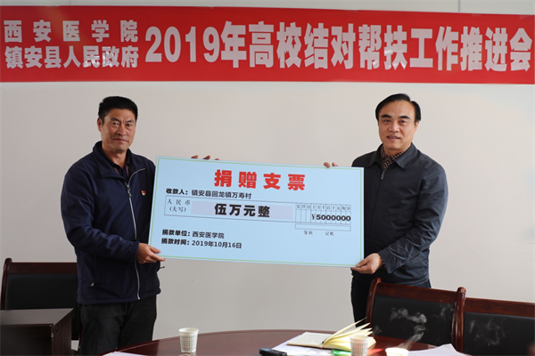会上,杨帆院长代表学校向镇安县捐资五万元,用于万寿村“标准化党支部”建设项目;姚文柱副院长代表学校与镇安县任淑霞副县长签定了《优质农产品消费扶贫框架协议》;我校第二附属医院院长吴胜军代表医院向万寿村卫生室捐赠了“健康一体机”设备一套。