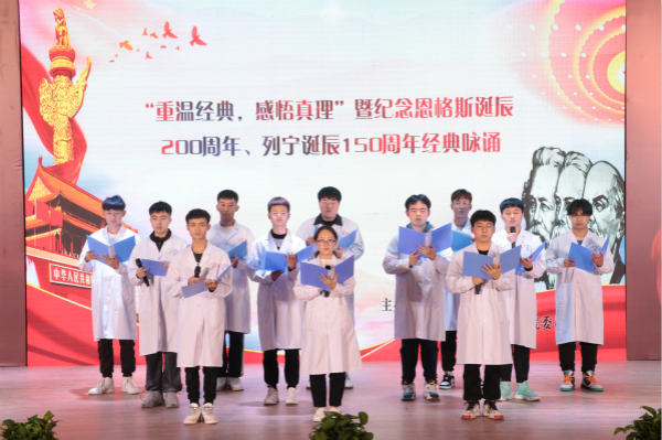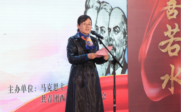 为纪念恩格斯诞辰200周年、列宁诞辰150周年,11月30日晚上,马克思主义学院与校团委在学术报告厅举行了“重温经典,感悟真理”为主题的经典咏诵活动。本次经典咏诵活动依托《马克思主义基本原理概论》课程,以全校各学院各专业2019级学子为主体,大家齐聚一堂,吟诵自己心中最美的经典诗篇,向伟大的革命先行者们致敬。校党委副书记熊冬梅出席活动并发表讲话。参加活动的还有校党委宣传部副部长刘军林、临床医学院党总支副书记吕宝、马克思主义学院院长桑利娥以及马克思主义学院教师李亚芳。担任本次活动评委的是校党委宣传部副部长刘军林、马克思主义学院院长桑利娥、“马克思主义基本原理概论”教研室主任王红、“原理”教研室教师刘晨博士和刘宁老师。马克思主义学院院长桑利娥致辞。