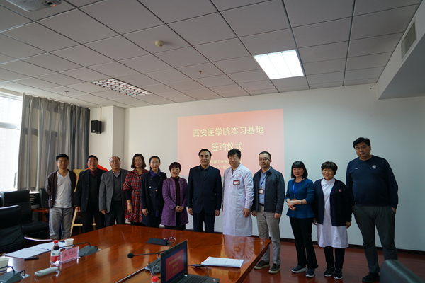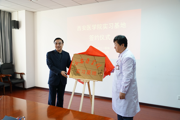 随后,我校院长杨帆与兵器工业521医院郭永明院长共同签约揭牌,仪式结束后双方合影留念,李雪萍副院长带领我校人员参观了医院的临床科室。