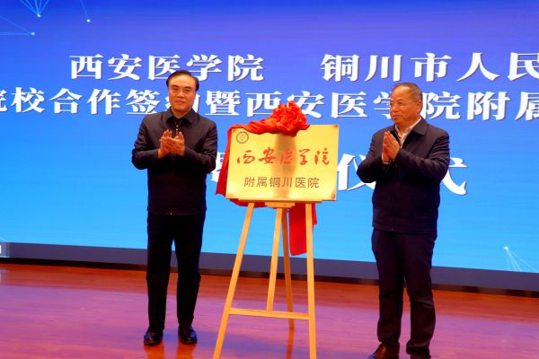 校长杨帆与铜川市副市长李荣为附属铜川医院揭牌