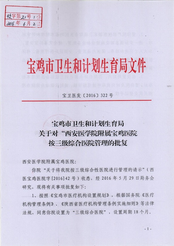 (附属宝鸡医院)近日,宝鸡市卫生和计划生育局正式给我校附属宝鸡医院下达批复,批准将该院以三级综合医院设置。这是附属宝鸡医院发展历程中取得的又一重要成果,标志着该院成功跻身三级综合医院行列,也为附属宝鸡医院向合格高等医学院校直属附属医院迈进奠定了坚实的基础。