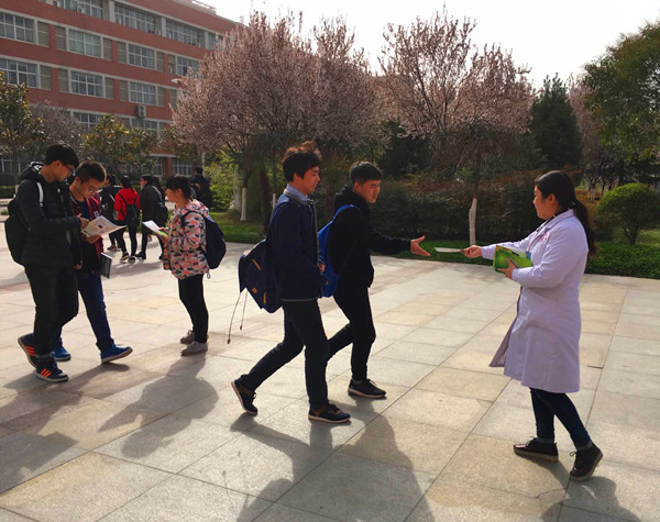 我校利用周末带领学生青年志愿者协会成员一起赴周边社区向居民宣传结核病知识。以深入宣传《传染病防治法》和《结核病防治管理办法》为重点,详细讲解结核病预防及常规治疗常识,大力宣传国家对结核病人诊疗减免检查费、免除治疗费等一系列优惠政策,通过向居民普及预防结核病知识,提高群众对结核病的防治意识和知晓率。