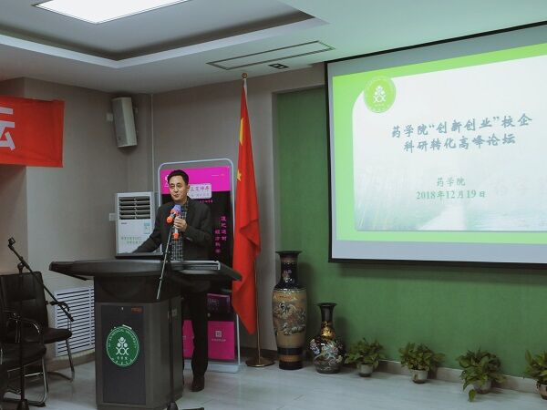 随后,副院长黄保强代表我校对国家非遗传承人柳惠武先生、杰出校友知名企业家的到来表示热烈的欢迎,对药学院双创校企合作科研转化高峰论坛的顺利召开表示祝贺,对药学院近些年的师资力量、发展情况、科研实力给予肯定,对药学院校企合作的发展提出殷切期望,希望在下一步的工作中能够充分发挥药学院资源,与知名企业联合,创新创业,加速科研转化,适应社会发展,为医药事业培养更多优秀的人才。