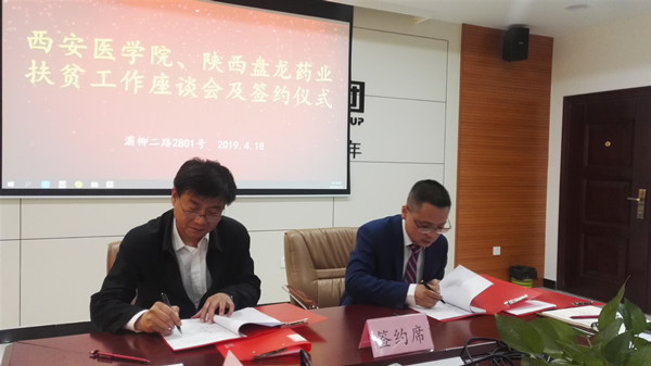 4月18日下午,我校与陕西盘龙药业联合扶贫工作座谈会及签约仪式在盘龙药业西安总部举行。我校副院长姚文柱,党政办公室、扶贫办公室、药学院、第一附属医院、第二附属医院、附属宝鸡医院及盘龙药业等相关负责人参加会议。