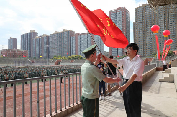 党委书记范兵向军训团授旗