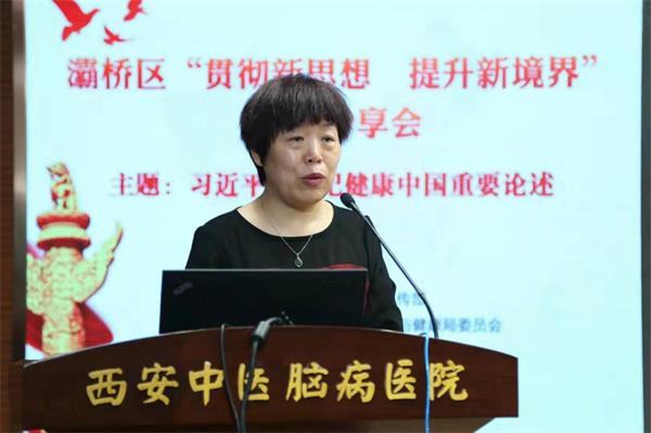 2019年8月1日下午,由灞桥区委、区政府举办的“贯彻新思想,提升新境界”学习分享会在西安中医脑病医院举行。我校党委委员、副院长李雪萍教授受邀作题为“健康中国”的主题报告。参加本次学习分享会的嘉宾有灞桥区委宣传部副部长杨桦,灞桥区卫健局专职副书记王晓峰以及灞桥区医疗系统的医生、护士及部分群众代表等300余人。同时我校马克思主义学院院长桑利娥、青年教师代表何梦焕也出席了此次会议。学习分享会由灞桥区卫健局专职副书记王晓峰主持。