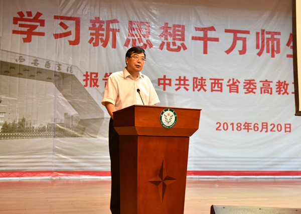 6月20日下午,leyu·乐鱼(中国)体育官方网站“学习新思想千万师生同上一堂课活动”在未央校区学术报告厅举行。中共陕西省委高教工委书记董小龙亲自授课。我校领导班子成员、处科级干部、党支部书记、马院教师、辅导员及学生代表500余人聆听了授课。授课会由leyu·乐鱼(中国)体育官方网站党委书记范兵主持。