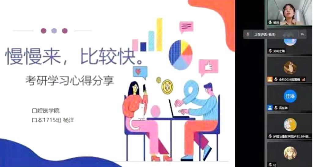 4位2020-2021学年国家奖学金获奖学生代表临床医学院高佳琳、外国语学院贺唐欢、口腔医学院杨洋、卫生管理学院王玉欣分别从学习科研、英语学习、考研复习、社会实践等方面与大家进行交流,勉励同学们要积极探索、勇于尝试,在不断实践中找到适合自己的人生方向。