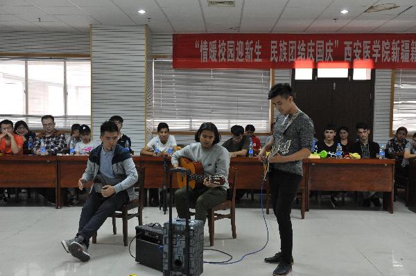(学工部)9月30日下午,一场别开生面的国庆庆祝活动在我校图书馆五楼会议室举行,学校党委副书记熊冬梅、陕西省委高教工委学工部副部长库来西‧依不拉音、新疆内派服务管理教师、学工部全体人员、各院(系)党总支书记、学生科长、辅导员以及来自新疆地区的维吾尔族、哈萨克族、柯尔克孜族、乌孜别克族、回族、蒙古族、汉族等100余名师生共聚一堂,其乐融融,热烈庆祝第67个国庆节。座谈会由学工部副部长、校团委书记王燕主持。首先,新疆内派服务管理教师安顺凤和白晓昱两位老师作了表态发言。他们表示一定要做好新疆籍学生的服务、教育和管理工作,使学生在校安心学习、顺利完成学业,同时也对学生提出要遵守学校纪律、珍惜学习机会的要求。