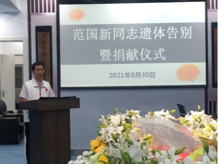 我校基础体育党总支副书记、基础医学部副主任张光伟代表基础医学部和全校的师生,向捐献者及其家属表示最崇高的敬意和最真挚的感谢!感谢范国新老人的伟大壮举!感谢所有的家属对我校医学事业的大力支持!范国新老人的伟大奉献,是对生命延续最好的一种表达。