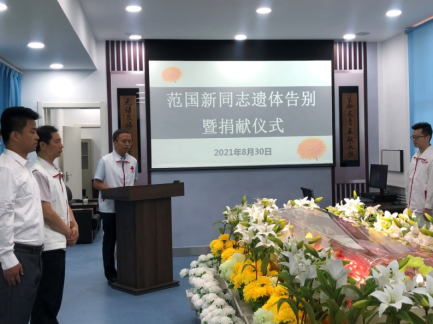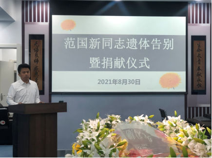 西安市红十字会负责遗体捐献工作的张学军同志代表陕西省人体器官捐献管理中心西安市工作站对范国新老人为社会主义精神文明建设、为祖国的医学事业发展,无私奉献的精神,表示崇高的敬意和谢意!对各位亲属的理解,支持亲人的爱心捐赠,最终使亲人的心愿得以实现,成功无偿捐献遗体和眼角膜,表示由衷的感谢!同时,对各位亲属表示最亲切的慰问!