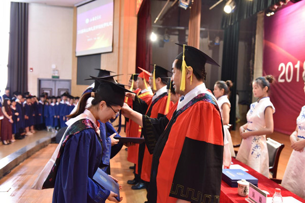 校党政领导为毕业生代表颁奖并为他们赠送了毕业礼物。随后,院长、校学位评定委员会主席杨帆宣读了学位授予决定,2018届获得硕士、学士学位的学子们盛装正冠,一一上台,接受“拨穗礼”,这一庄重的仪式标志着他们已经完成学业。