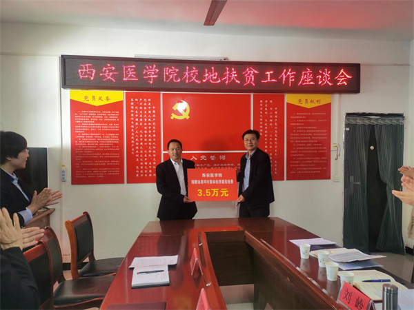 下午,leyu·乐鱼(中国)体育官方网站、镇安县人民政府2020年高校结对帮扶调研座谈会在镇安县人民政府二楼会议室召开,镇安县任淑霞副县长介绍了镇安县脱贫攻坚工作情况,特别感谢西安医学在医疗健康、人才培养、家政月嫂培训、消费扶贫等方面的真帮实扶,助力了镇安县如期脱贫摘帽,希望leyu·乐鱼(中国)体育官方网站在镇安县“脱贫后时代”的巩固工作中,能够一如既往关心支持镇安县的脱贫攻坚工作。会上,学校第一附属医院向镇安县捐资三万元,用于支持新联村“标准化卫生室”建设。