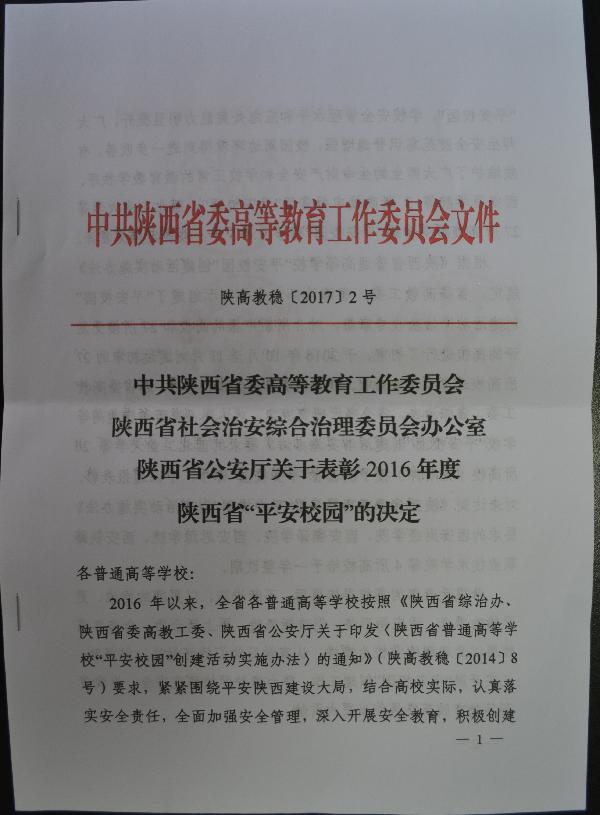(保卫处)3月1日,全省高校稳定安全工作会议在长安大学召开,会议表彰了获得2016年度“陕西省平安校园”的单位,我校荣获2016年度"陕西省平安校园"称号。党委书记范兵代表我校上台领奖,参加会议的校领导还有院长杨帆和党委副书记熊冬梅。 在学校党委、行政的领导下,在全校安全战线工作同志的辛勤付出和全体师生的共同努力下,我校始终把省级“平安校园”建设作为保障教学、科研的基础工作来抓,努力提升学校安全保卫工作水平,不断增强师生防范意识,扎实做好我校及周边地区治安综合治理工作,创建学校及周边地区的良好治安秩序,确保校园的安全稳定。