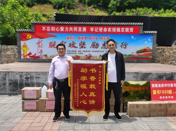 会后,黄保强副院长代表学校向油房坪村图书室捐赠1000册图书,价值32420.3元人民币;向油房坪村及村小学捐赠价值6868元的额温枪、口罩、消毒液、抗病毒颗粒等防疫物资;向村小学捐赠113册图书及价值1400元的文具。村小学校长代占军代表小学全体师生对我校一年来给予小学的多次捐赠活动表示感谢并赠送锦旗。之后,黄保强副院长又查看了我校第二附属医院11名一线医疗专家及研工部6名临床医学硕士研究生面向全村的义诊活动,查看了我校援建村图书室建设情况。